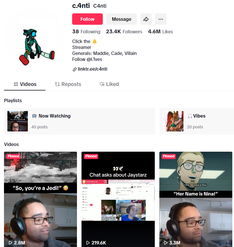 C4NTI is a fast-growing TikTok and Twitch streamer whose unique energy and creative approach to streaming has created a tight and loyal community.
